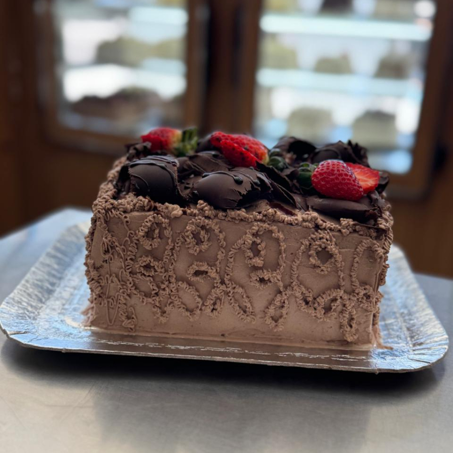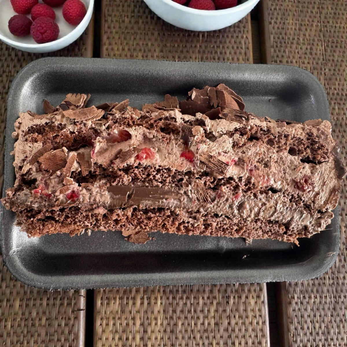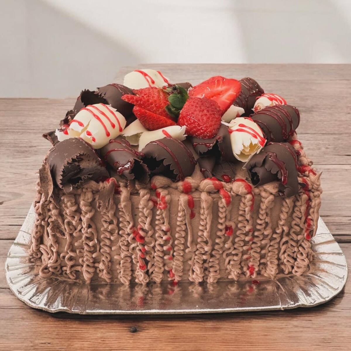Trufado preto, mousse de chocolate e morangos . Decoração raspas pretas e morangos.