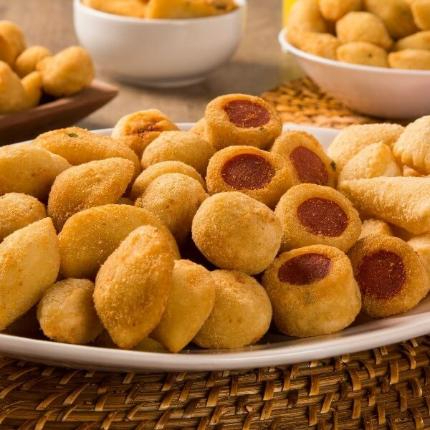 Enroladinho de salsicha croquete de carne bolinha de queijo travesseiro de calabresa risolis presunto e queijo