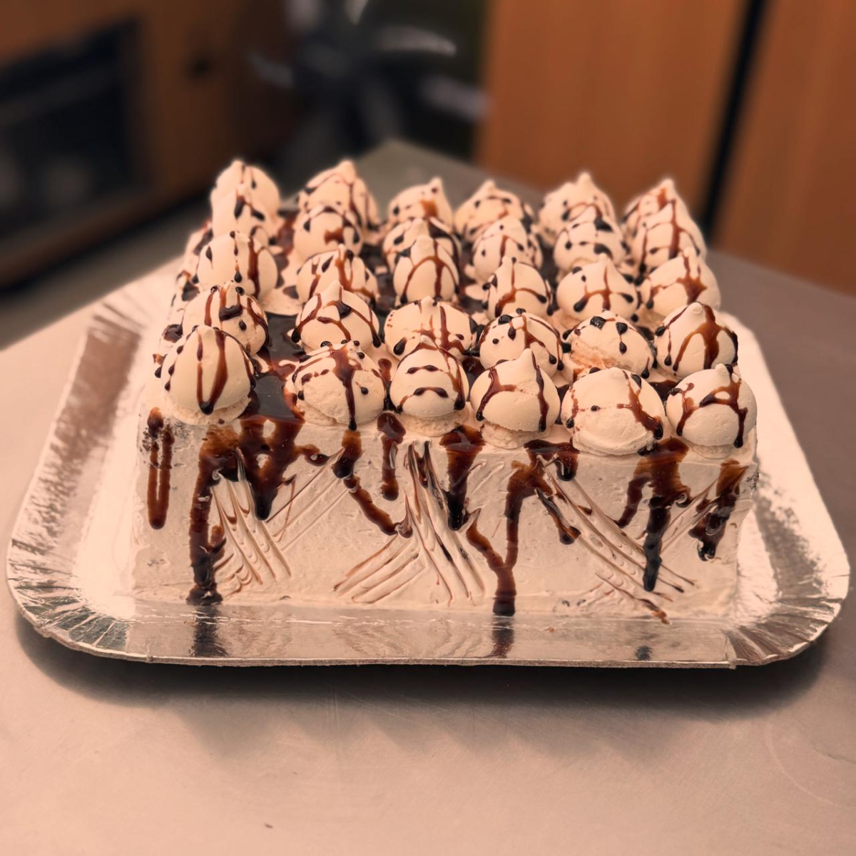 Trufado preto e mousse branco Decoração suspiro e calda de chocolate