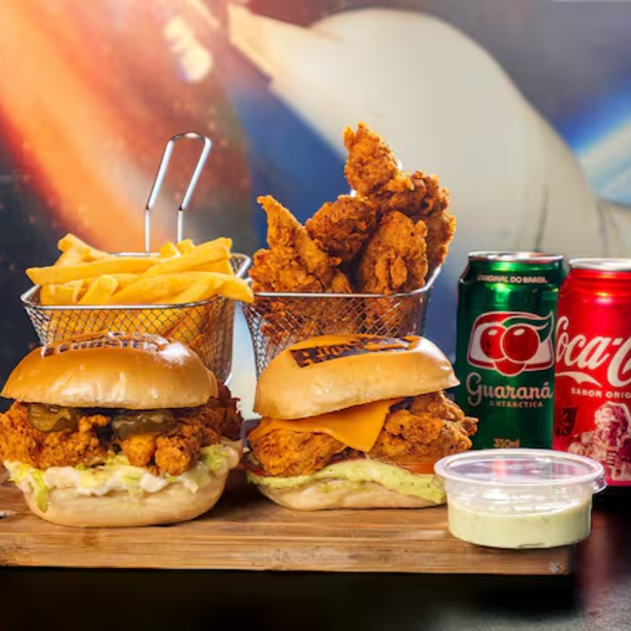 Acompanha 2 lanches a sua escolha , 1 molho , 1 batata individual , 2 tiras de frango , e 1 coca 600ml