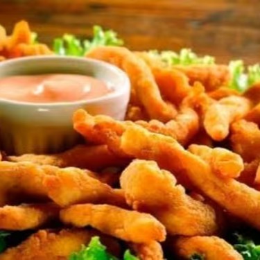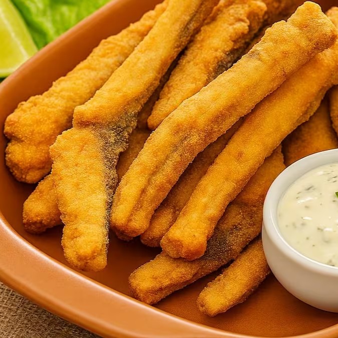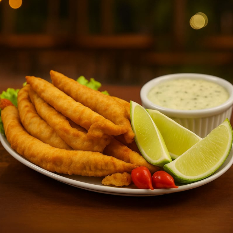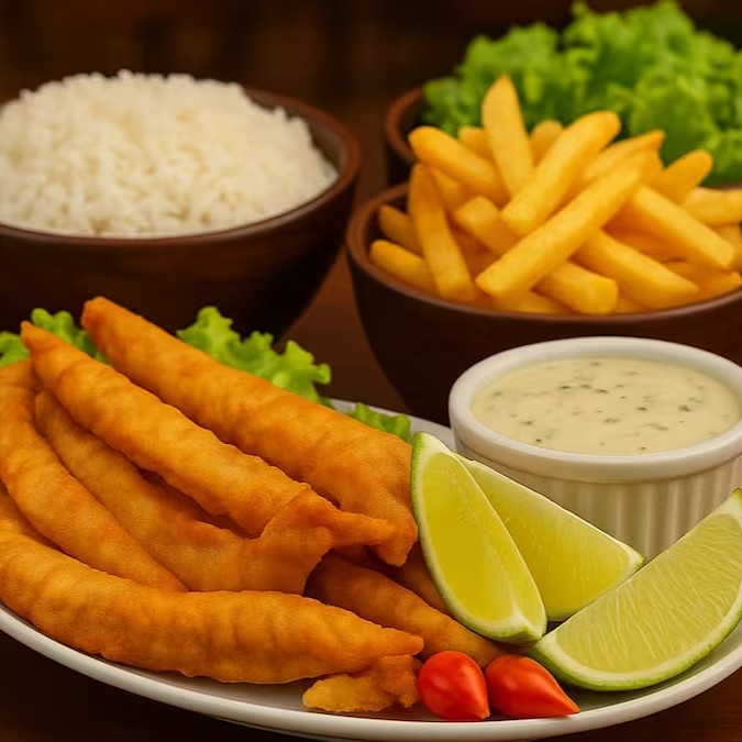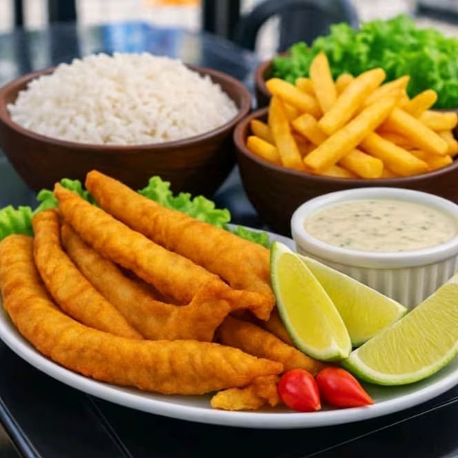Deliciosa porção de filé de tilápia em Iscas, empanado e temperado.