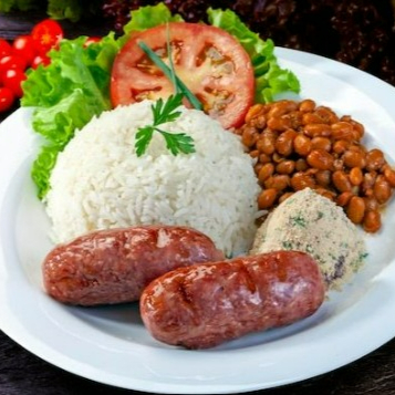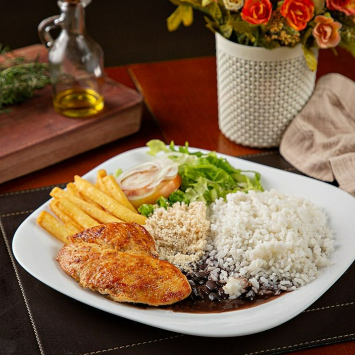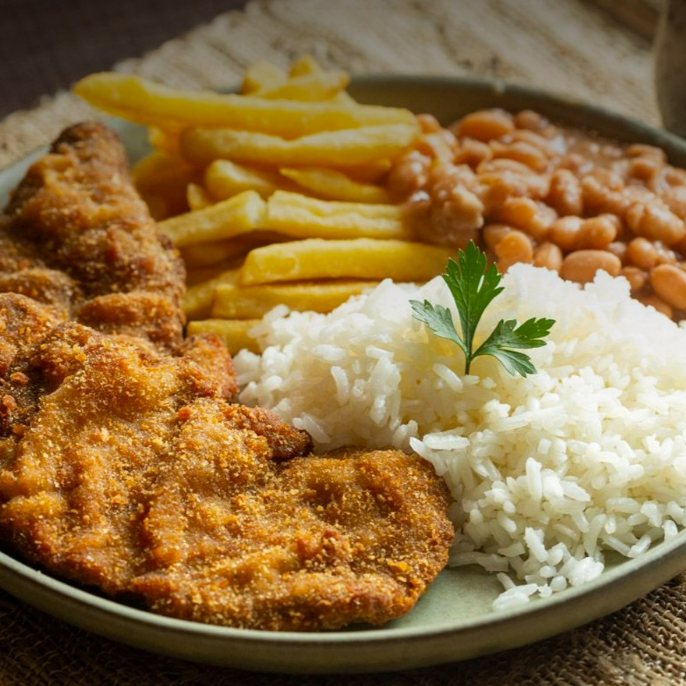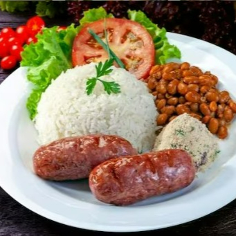 Deliciosa comida caseira, acompanha arroz branco soltinho, farofa, batata frita e feijão.