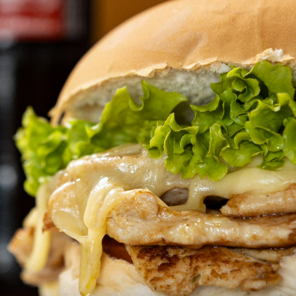 Delicioso lanche com Pão, filé de frango, presunto, queijo, bacon, alface, tomate, ketchup e maionese