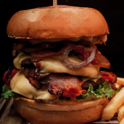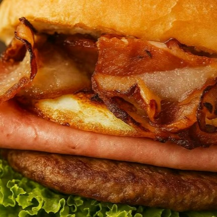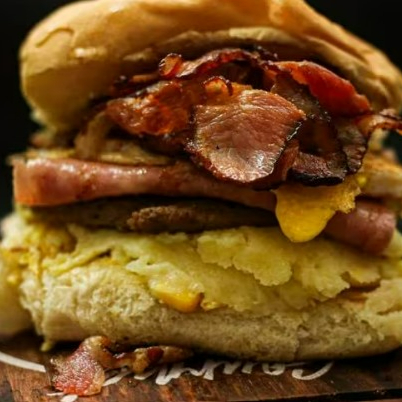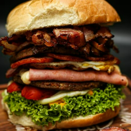 Delicioso lanche com Pão, hambúrguer, presunto, queijo, calabresa, ovo, bacon, alface, tomate, ketchup e maionese