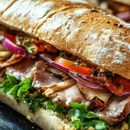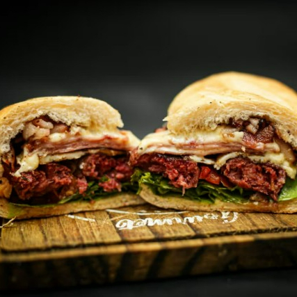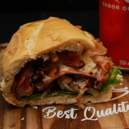 Delicioso lanche com pão Baguete, contra file, presunto, queijo, ovo, bacon, cebola alface, tomate, ketchup e maionese