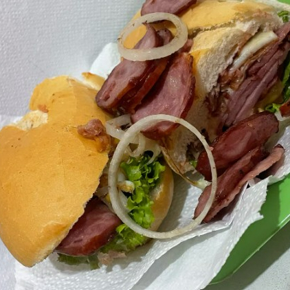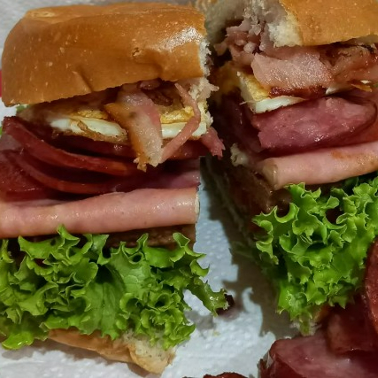 Delicioso lanche com pão Baguete, calabresa, presunto, queijo, ovo, bacon, cebola alface, tomate, ketchup e maionese