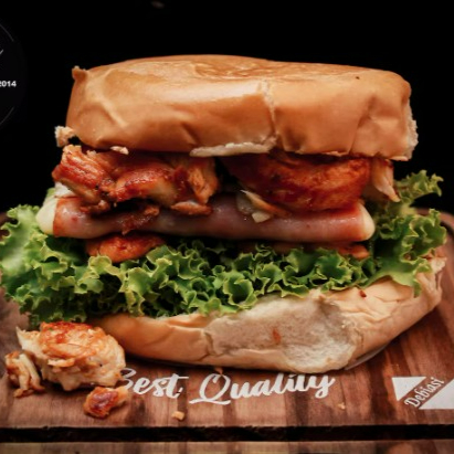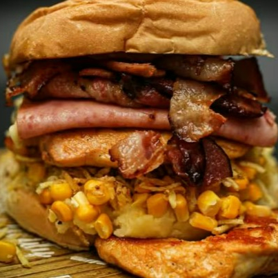 Delicioso lanche com Pão, filé de frango, queijo, bacon, milho, purê de batata, ketchup e maionese.
