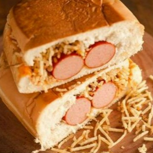 Delicioso Hot Dog com pão, salsicha, calabresa, Catupiry, milho, tomate, ketchup, maionese, purê de batata e batata palha