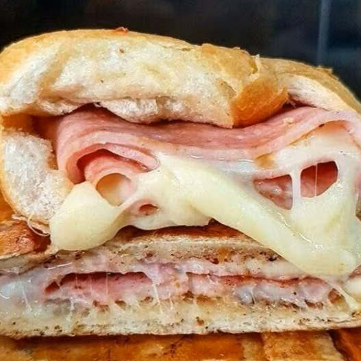 Delicioso lanche com pão Baguete, 3 fatias de presunto, 3 fatias de queijo.