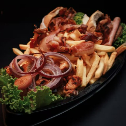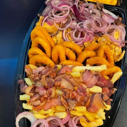 Deliciosa porção mista com Onion rings, Batata frita com cheddar e bacon, Calabresa, Filé de frango e Contra Filé