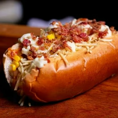 Delicioso Hot Dog com Pão, salsicha, bacon, Catupiry, milho, tomate, ketchup, maionese, purê de batata e batata palha