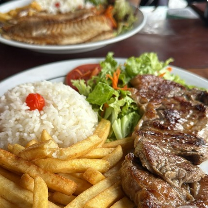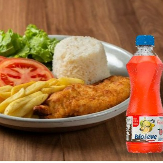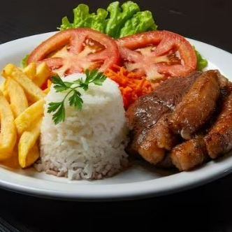 Deliciosa comida caseira, acompanha arroz branco soltinho, salada fresca, batata frita e feijão.