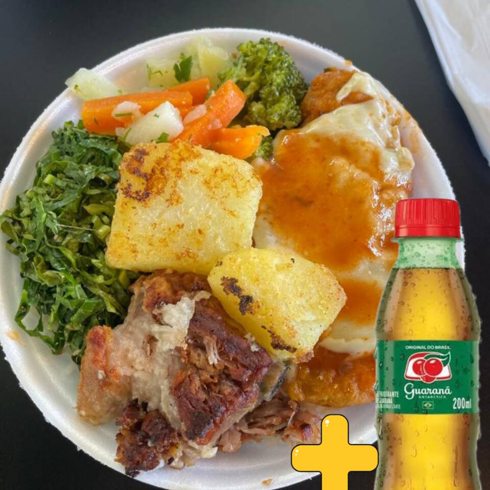 eliciosa marmita Média acompanhada de: - Arroz - Feijão + 2 mistura + 2 acompanhamentos + 1 Refrigerante 200ml Grátis (Sabor Sortido)