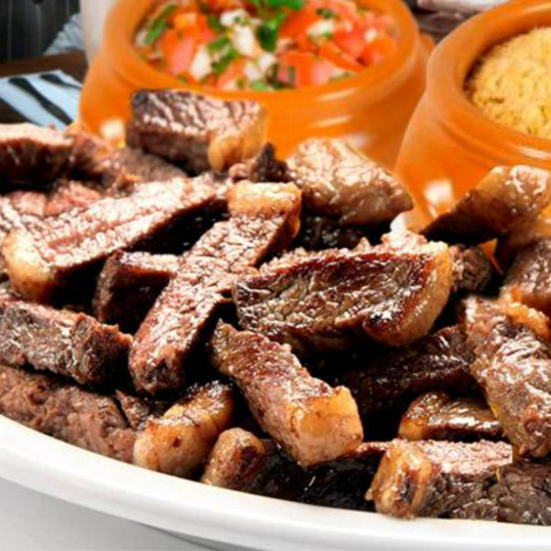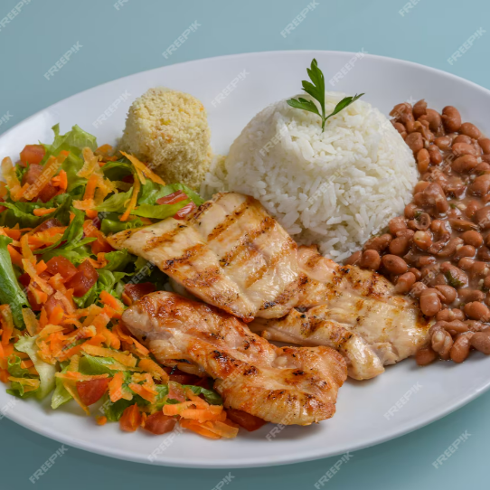 Deliciosa comida caseira, acompanha arroz branco soltinho, salada fresca, farofa e batata frita.