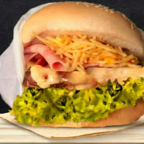 Pão, hambúrguer, 2 presunto, 2 queijo, catchup e maionese