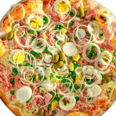 1 Pizza Portuguesa Molho artesanal, presunto, ovo, cebola e mussarela + 1 Pizza Calabresa molho cebola 8 Pedaços