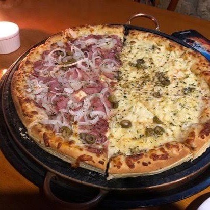 Metade calabresa acebolada metade bauru presunto tomate e mussarela