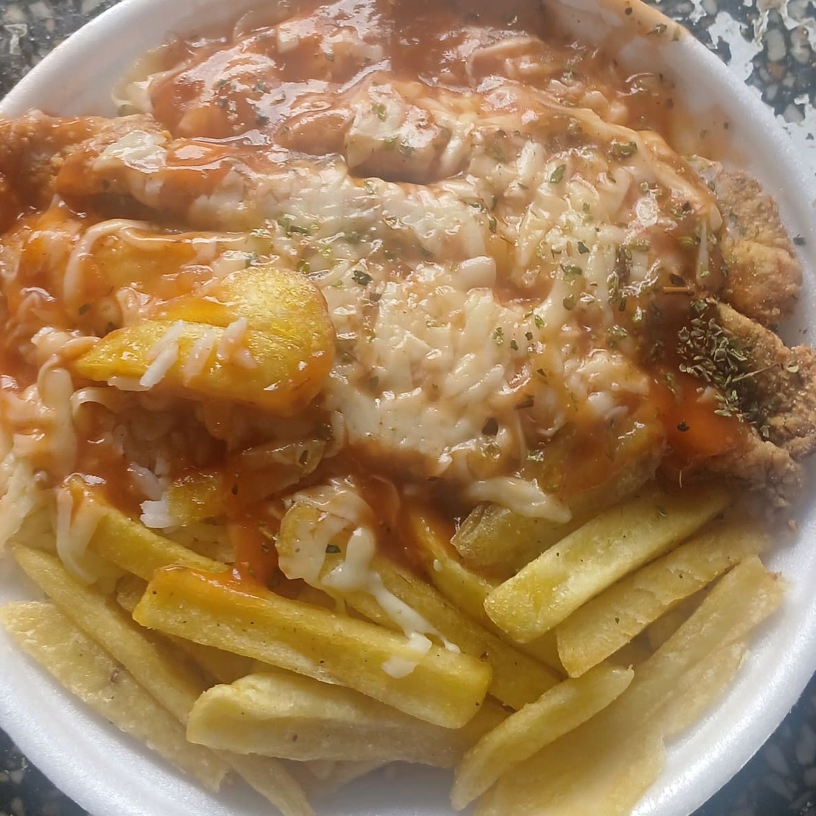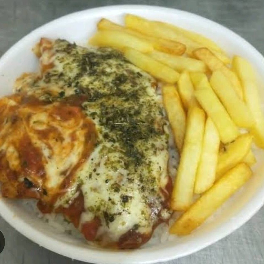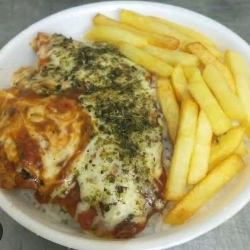 Filé de Frango com molho e Queijo Mussarela, Arroz, Feijão e Batata Frita.