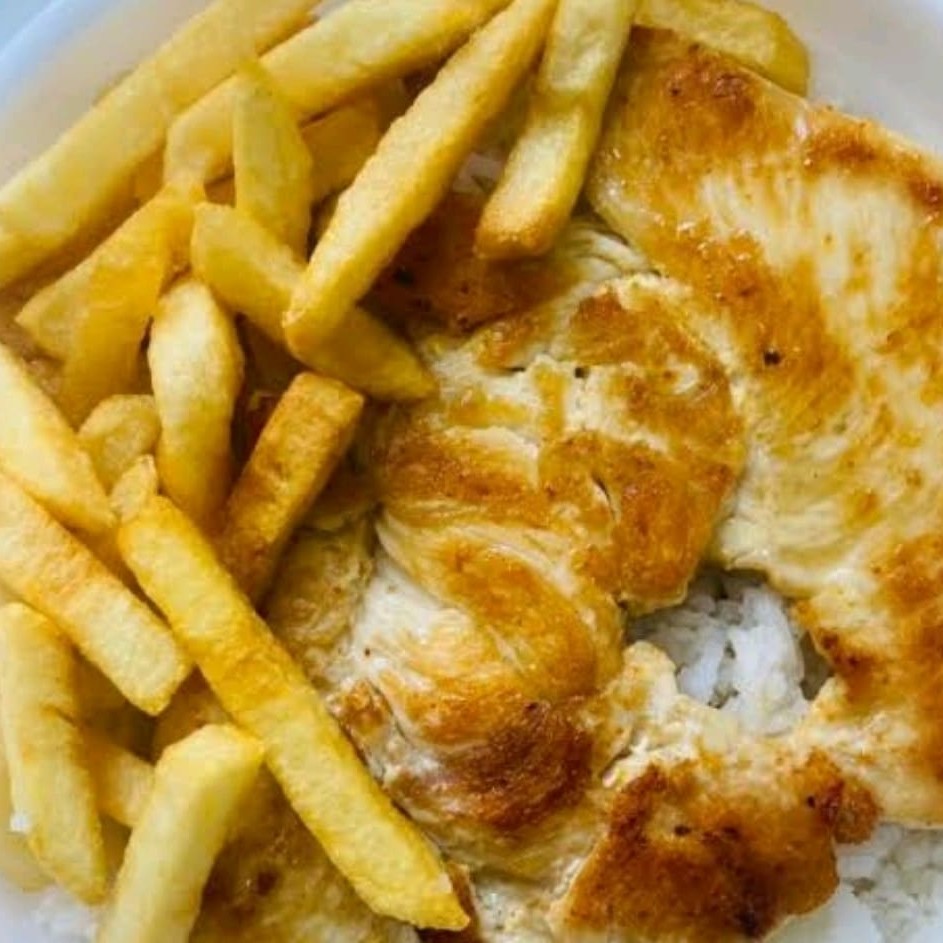 Filé de Frango Frito, Arroz, Feijão e Batata Frita.