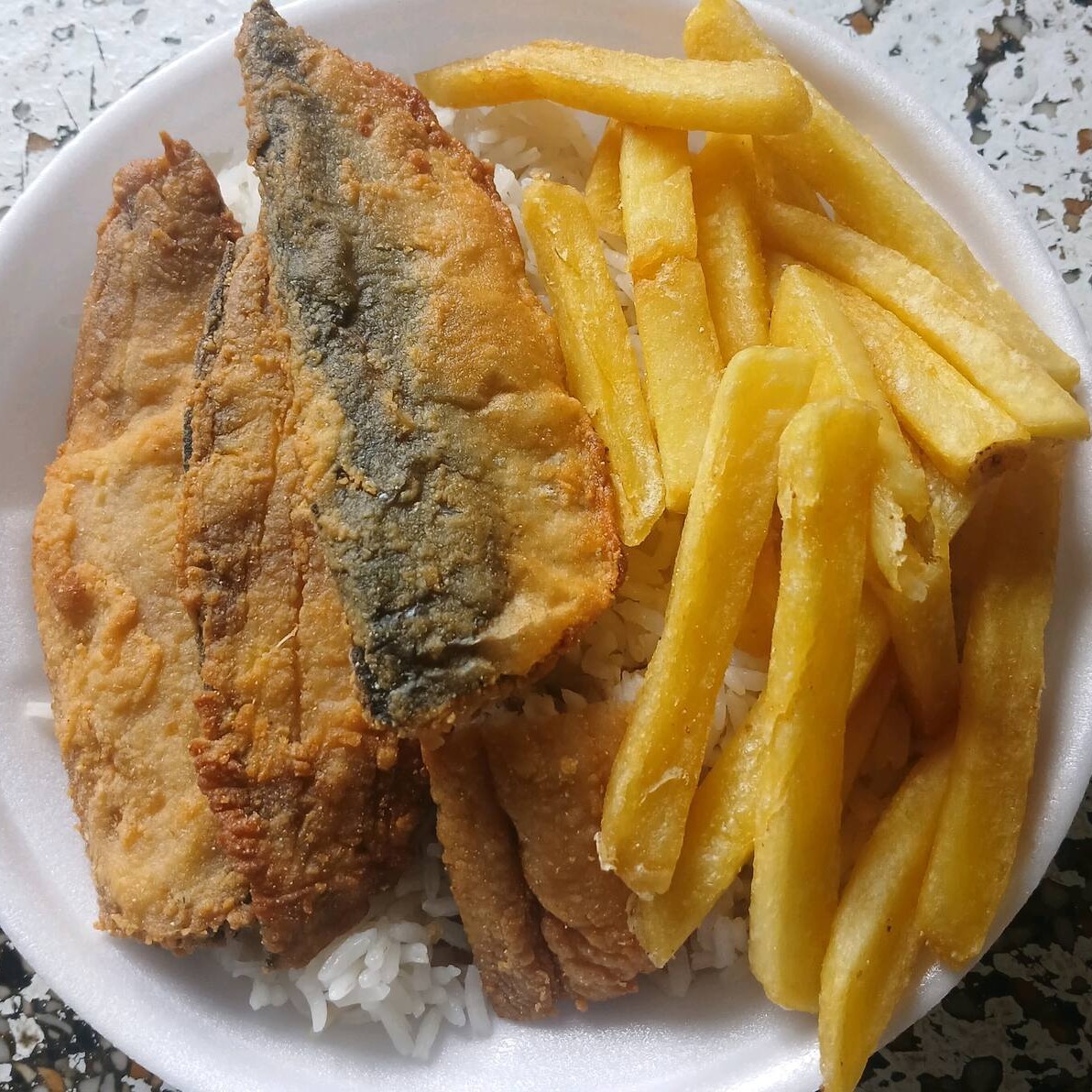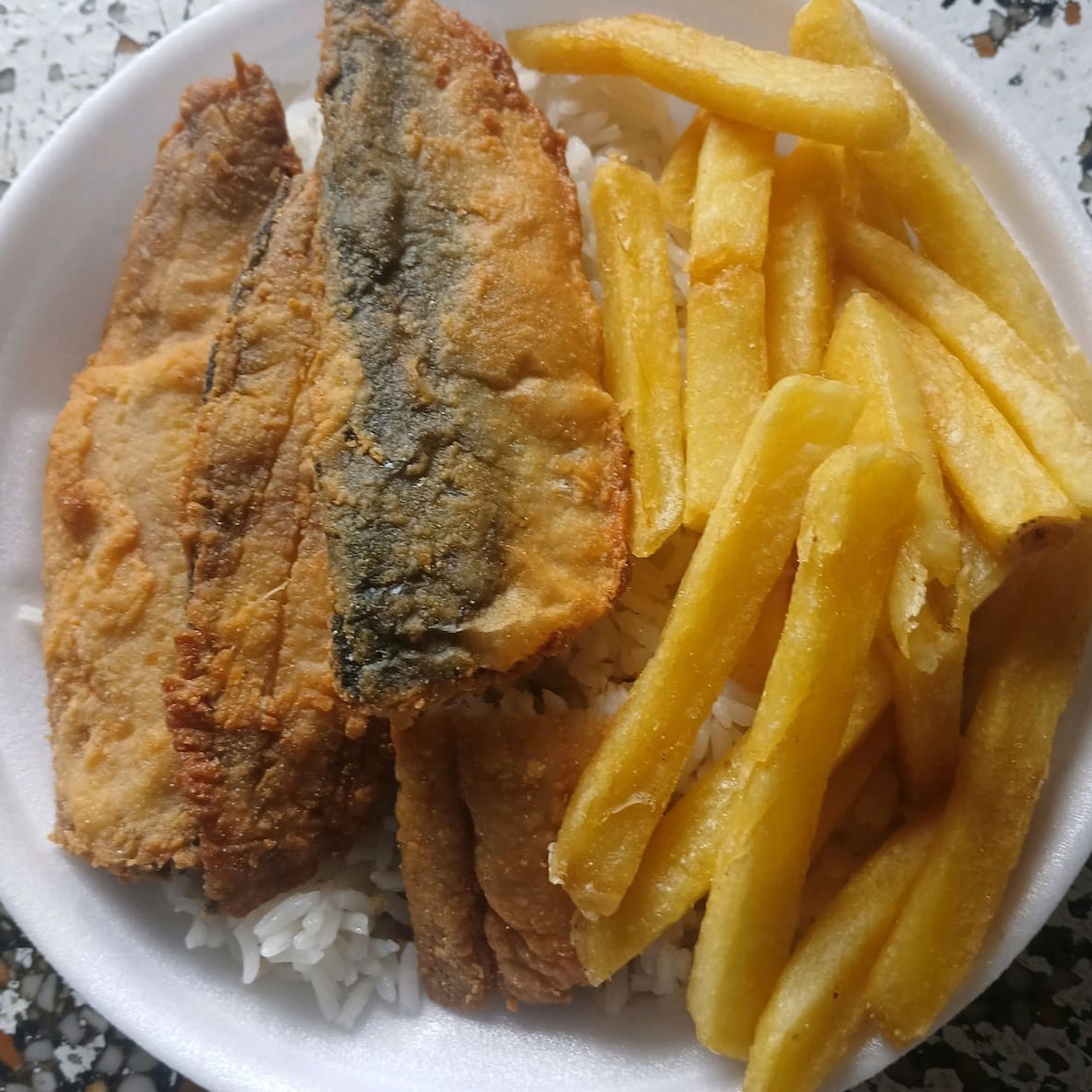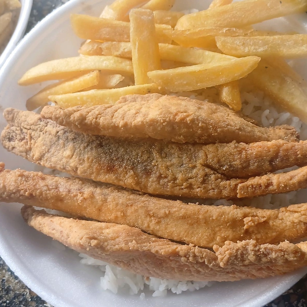 Sardinha Empanada e Frita, Arroz, Feijão e Batata Frita.