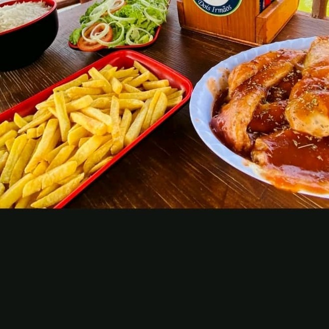 Tilápia Empanada e Frita, Arroz, Feijão, Batata Frita e Salada Simples.