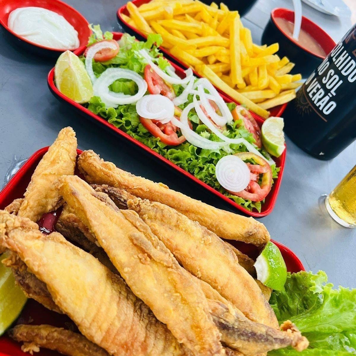 Tilápia Empanada e Frita com molho e Queijo Missarela, Arroz, Feijão e Batata Frita.