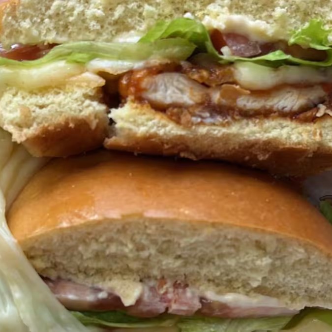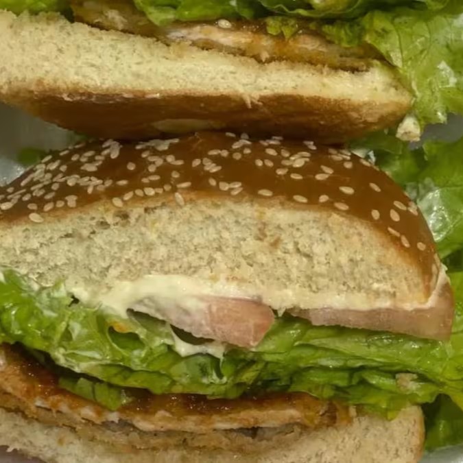 Frango frito ao nosso estilo (apimentado!!), tomate, alface, queijo muçarela, maionese e pão de hambúrguer!! Você vai amar!!
