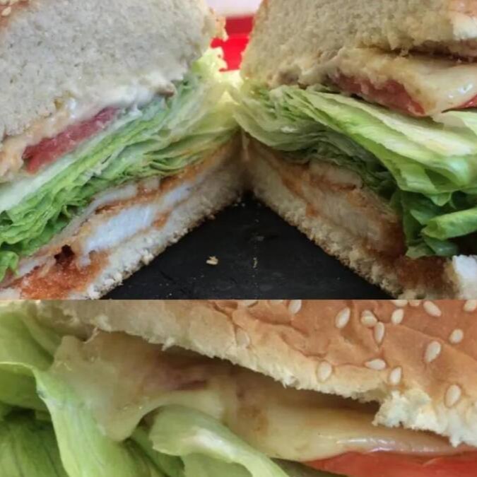 Frango frito ao nosso estilo (com pimenta e levemente agridoce!!), tomate, queijo muçarela, alface, maionese e pão de hambúrguer!! Você vai amar!!