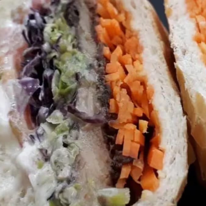 Pão francês, frango frito ao nosso estilo, alface, tomate, repolho roxo, cenoura, maionese e nosso molho tonkatsu!!