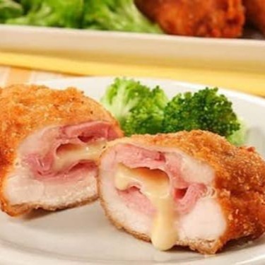 Um delicioso Filé de Frango a milanesa recheado com Presunto e Mussarela, Acompanha Arroz, Feijão, Farofa e Batata frita + Potinho de salada (alface e tomate).