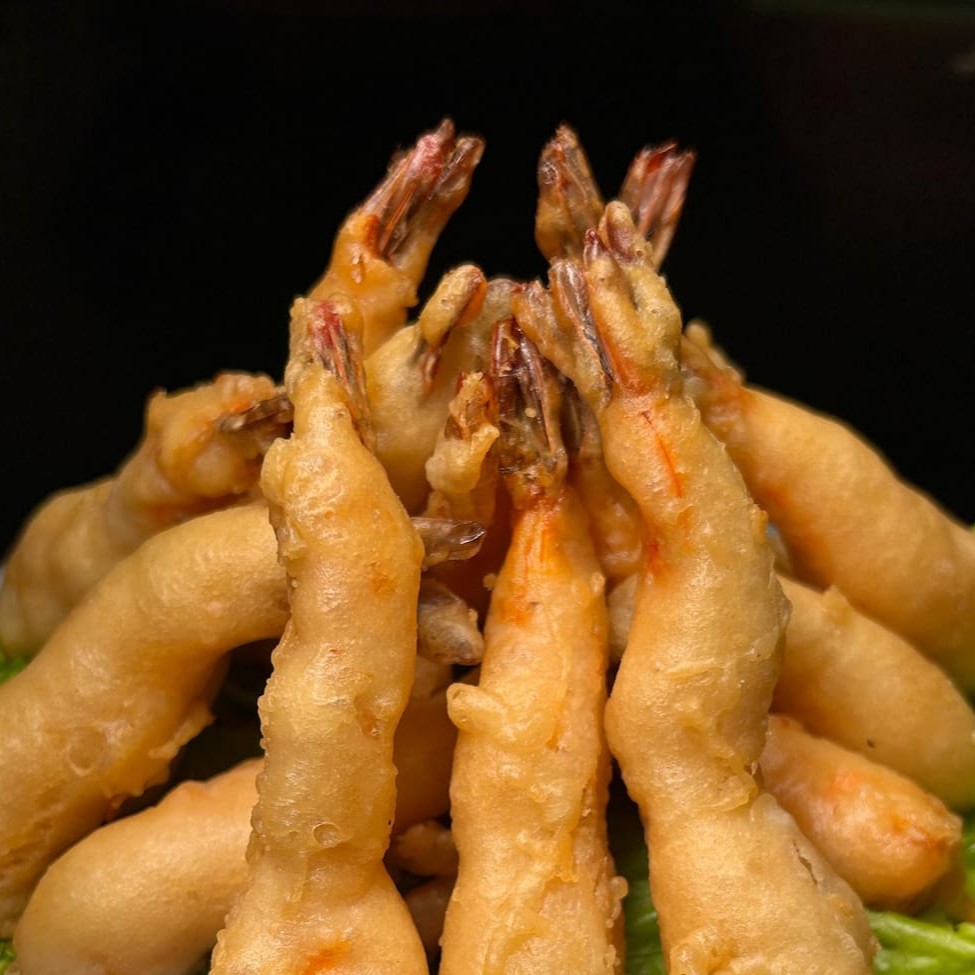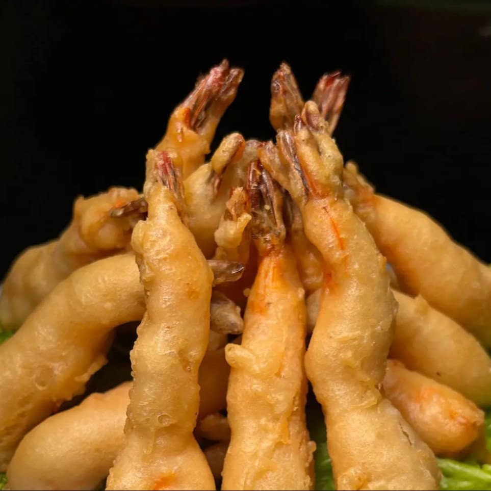 Alface radiccio, cenoura, rúcula, tomate cereja e camarões empanados