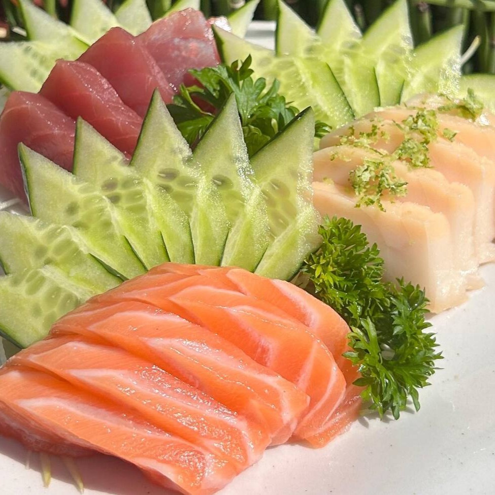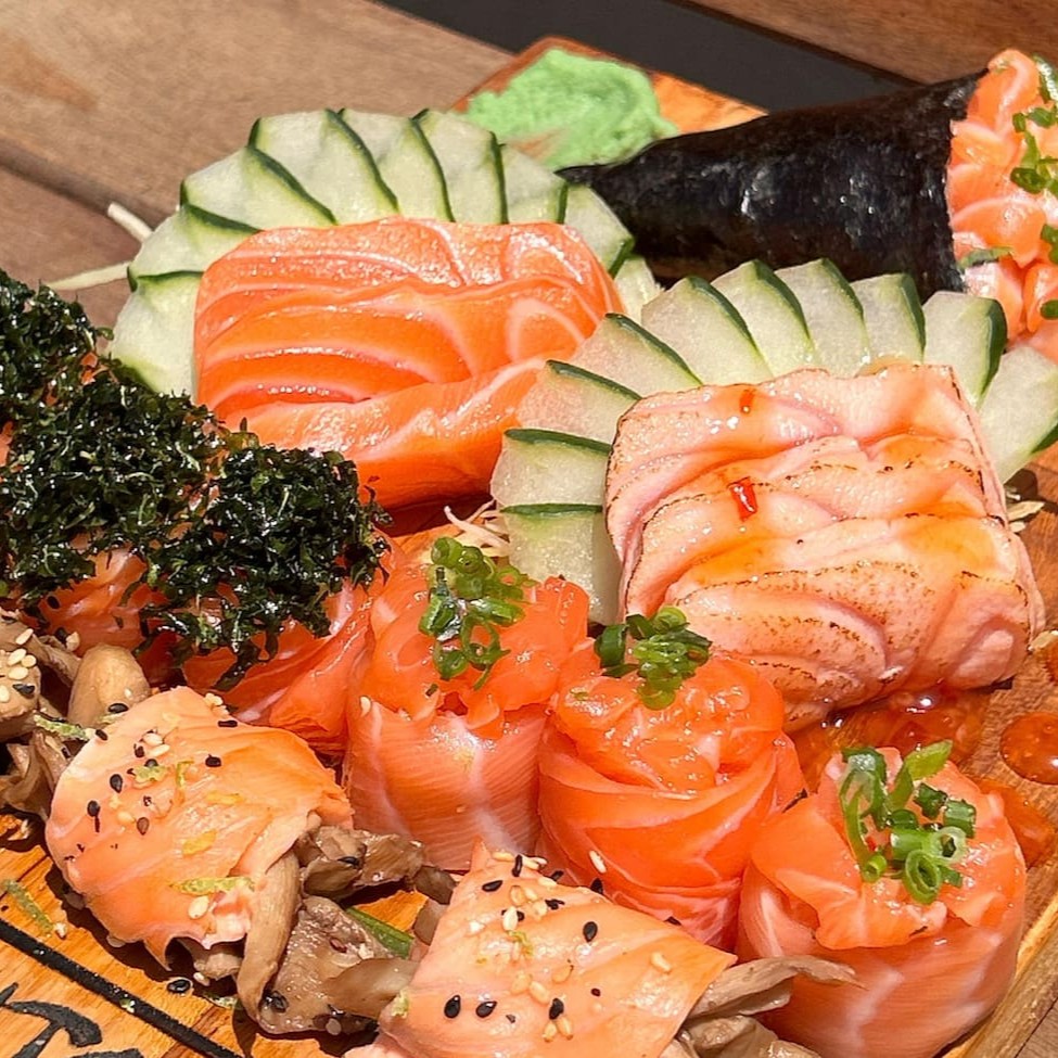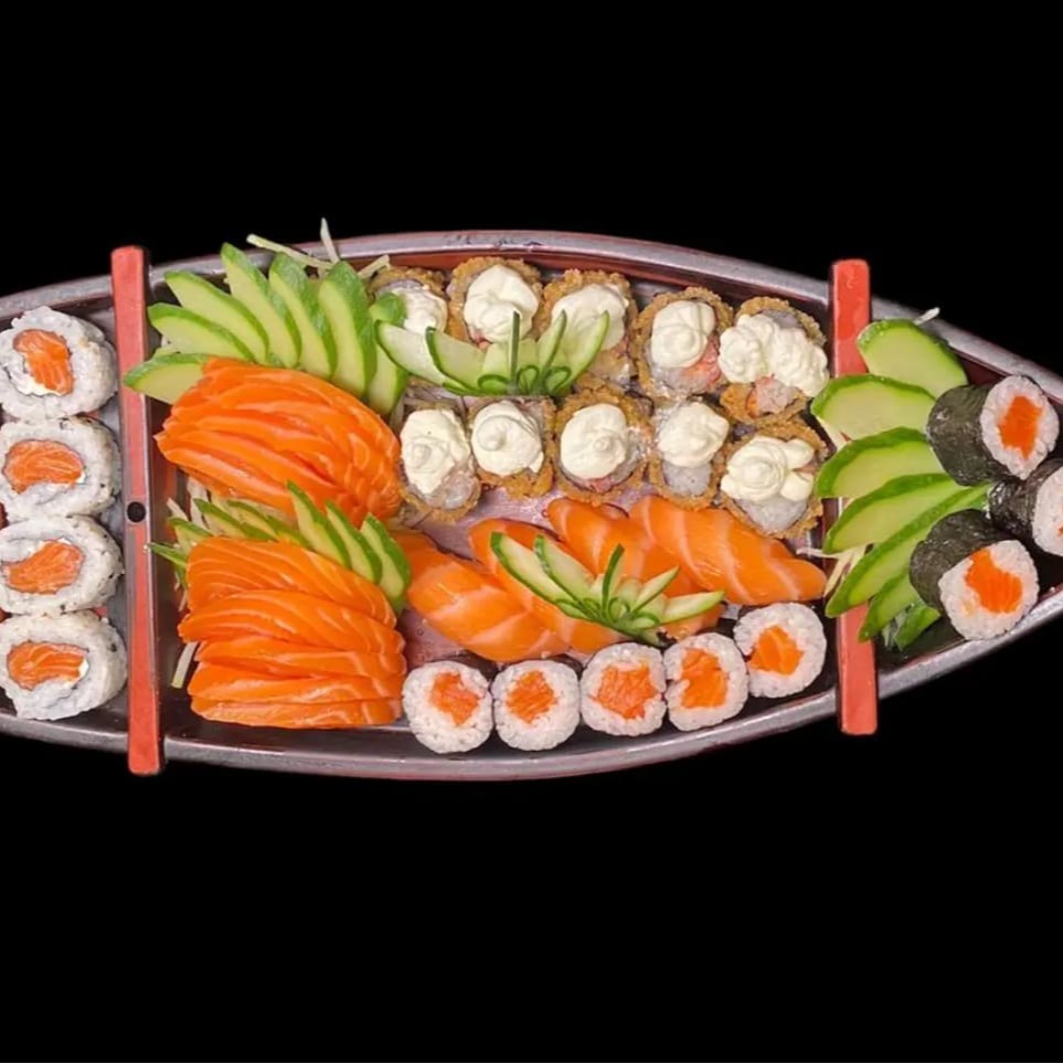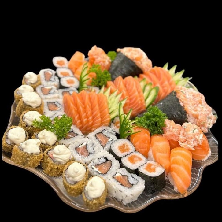 10 sashimis de salmão,8 hossomaki, 4 uramaki de salmão, 4 niguiri de salmao, 10 hot roll.