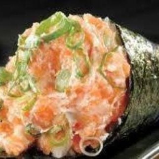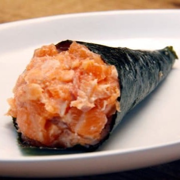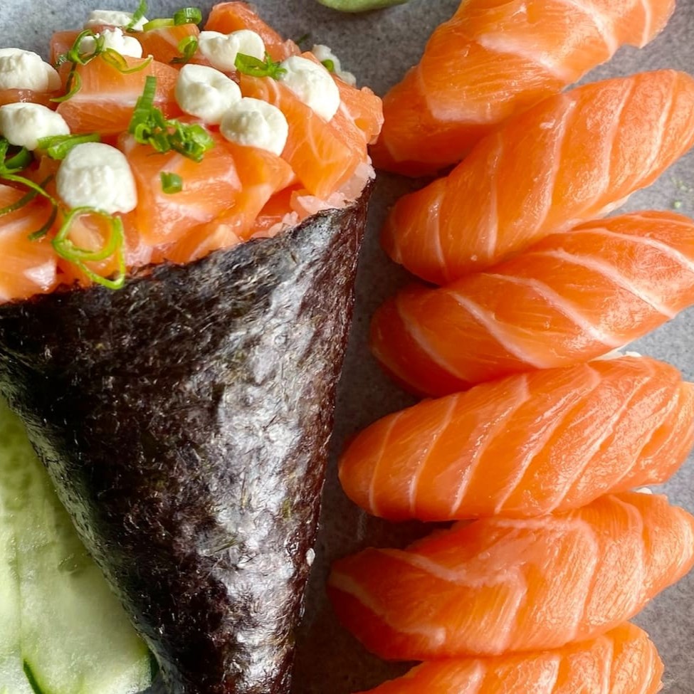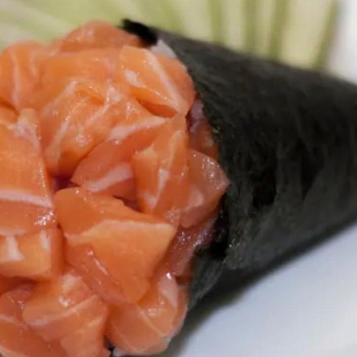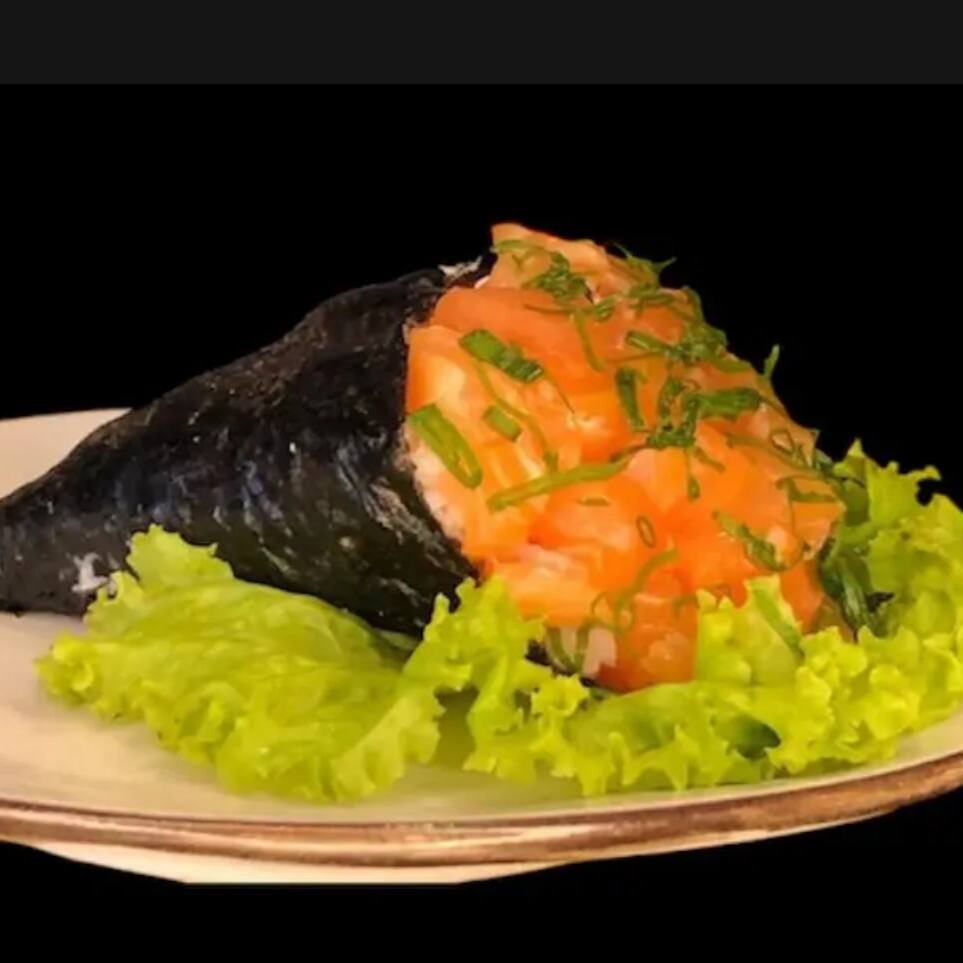 1 Temaki de salmão com cream cheese e cebolinha e cinco sashimis de salmão