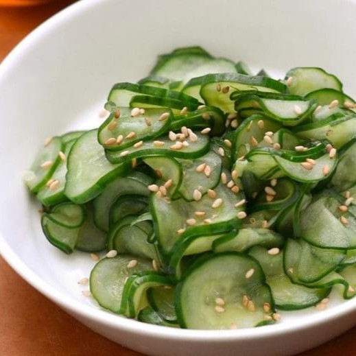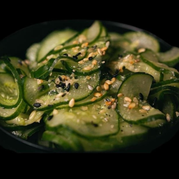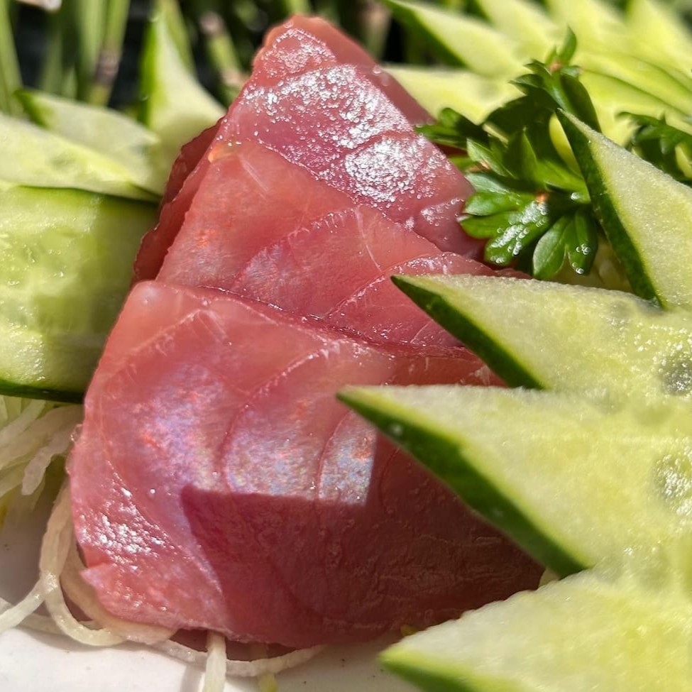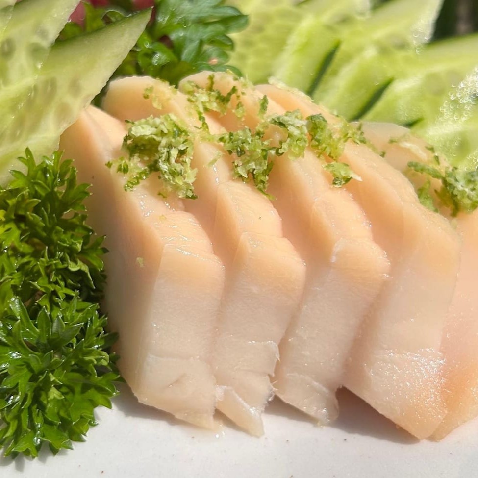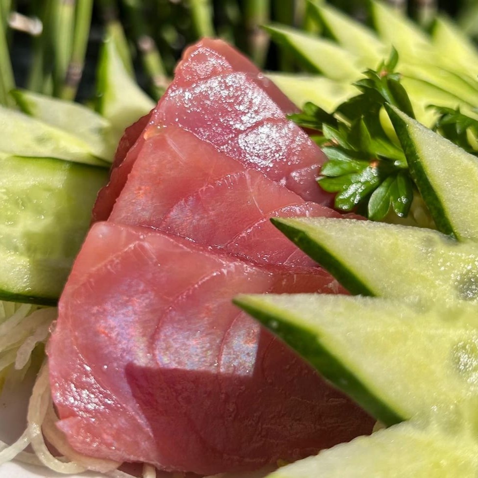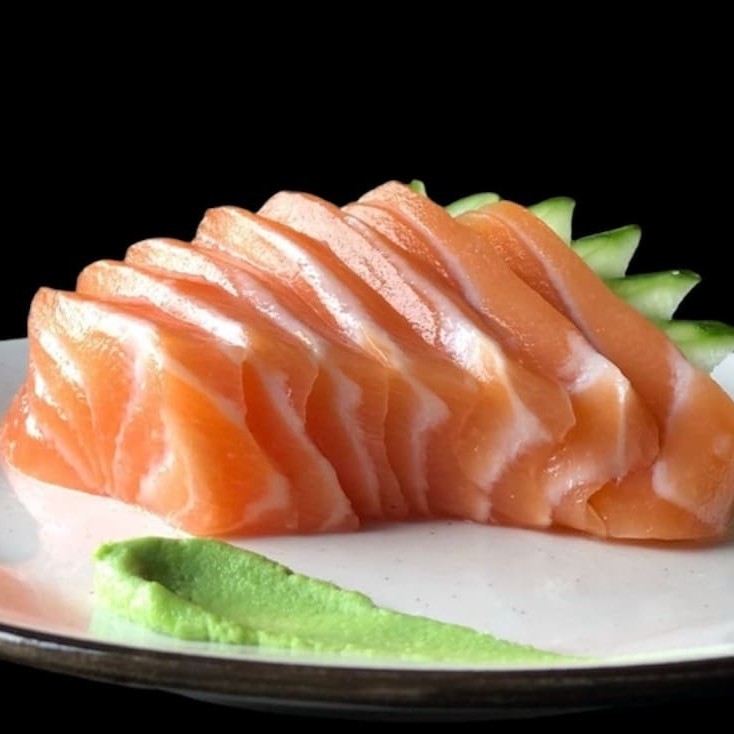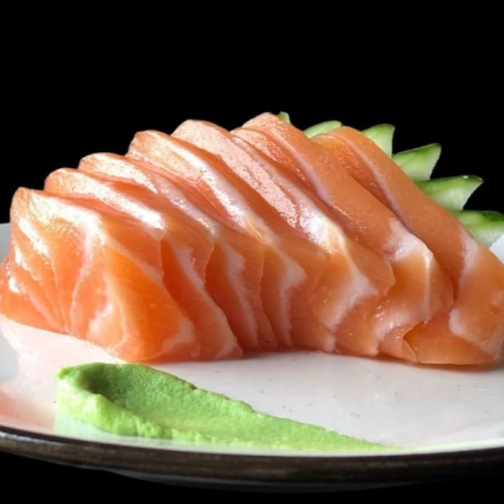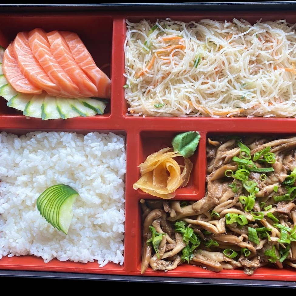 7 fatias de sashimis de salmão, salada de bifum, shimeji e gohan