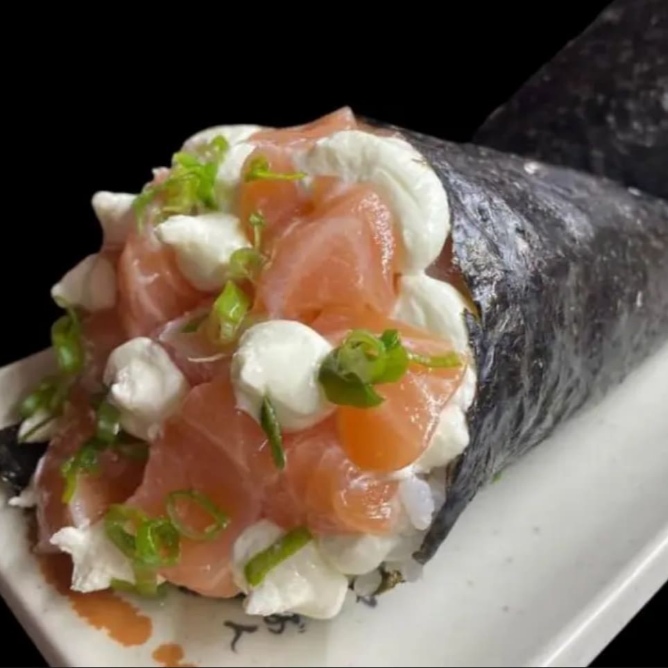 1 Temaki de salmão com cream cheese e cebolinha e seis niguiri de salmão