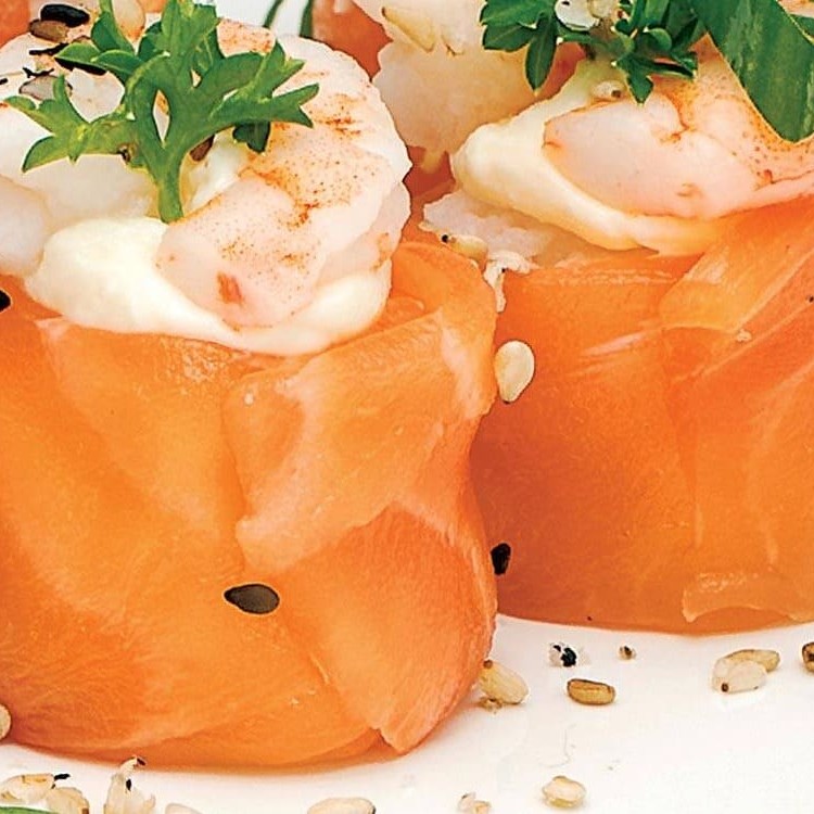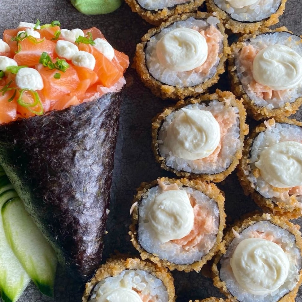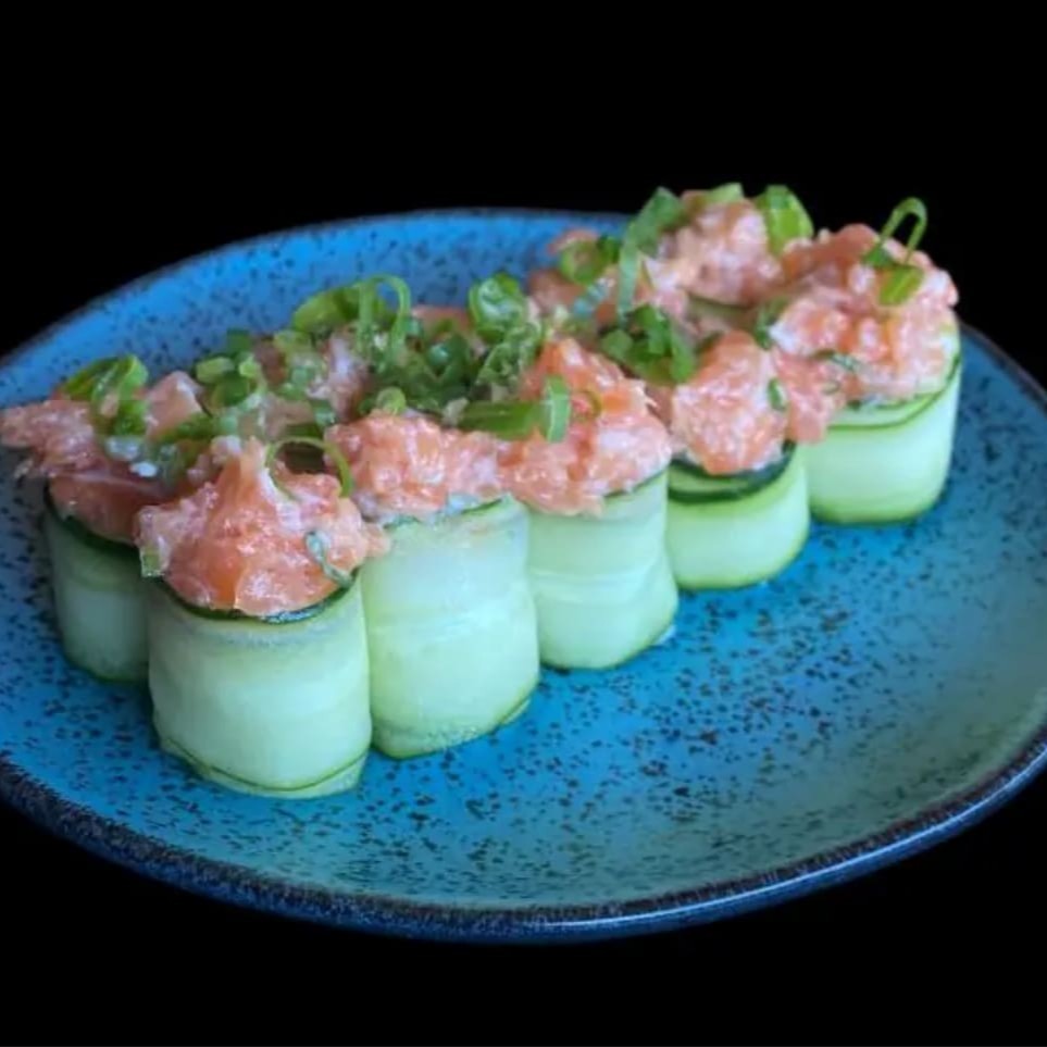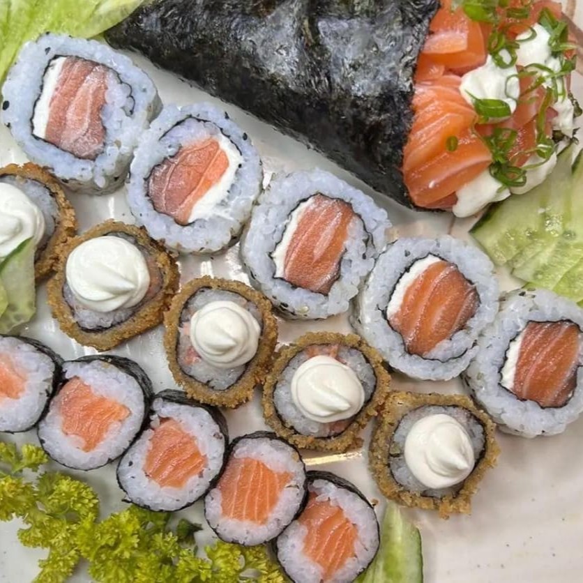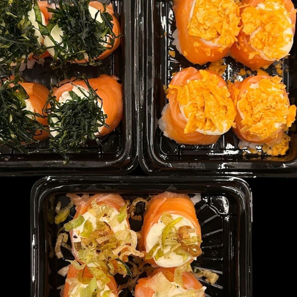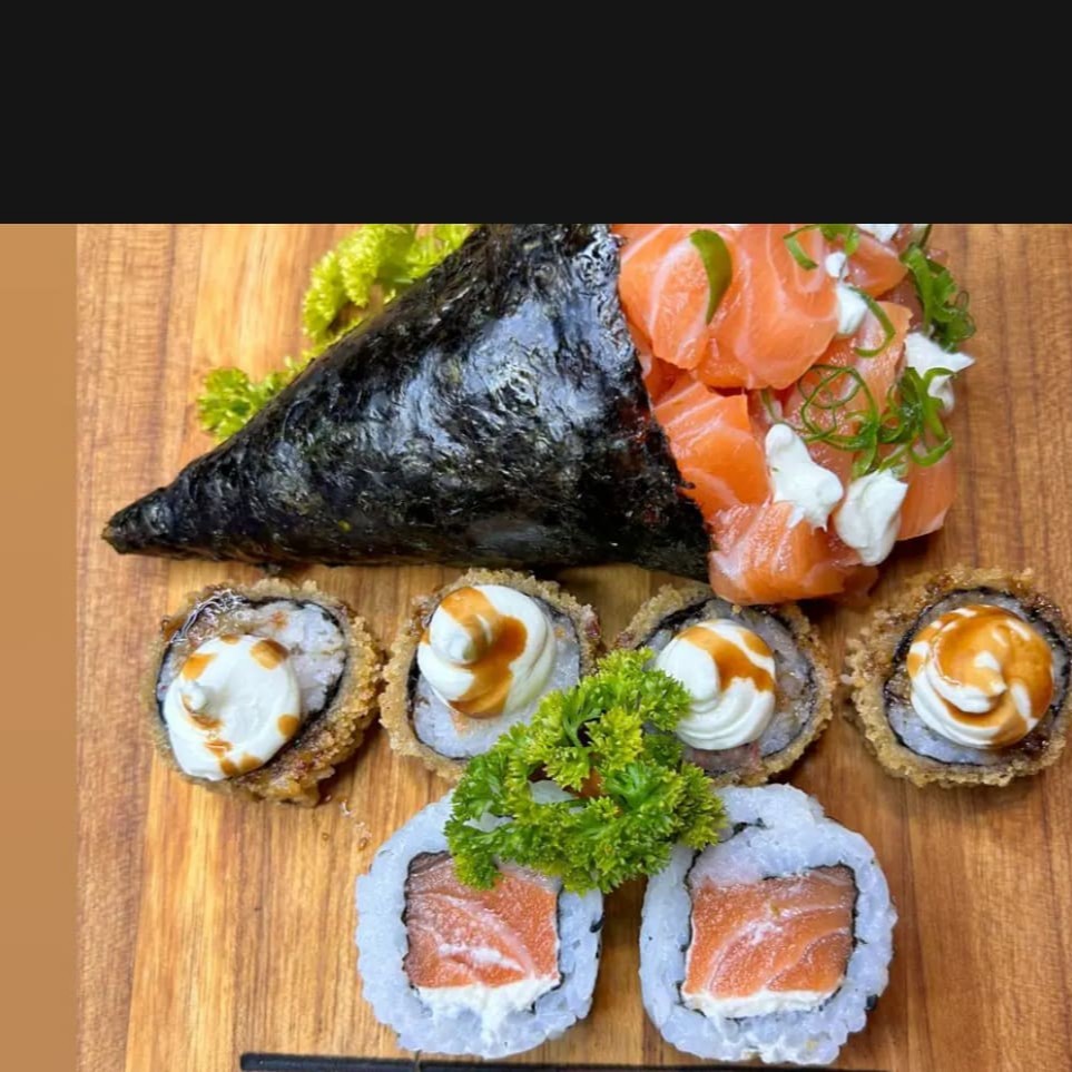3 niguiri, 2 joe salmão, 2 joe de pepino 2 uramaki filadelfia, 2 uramaki com couve