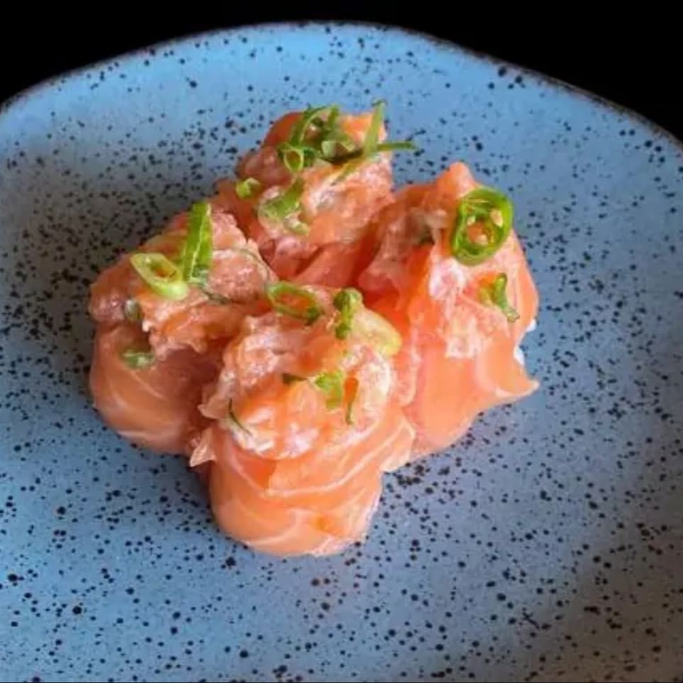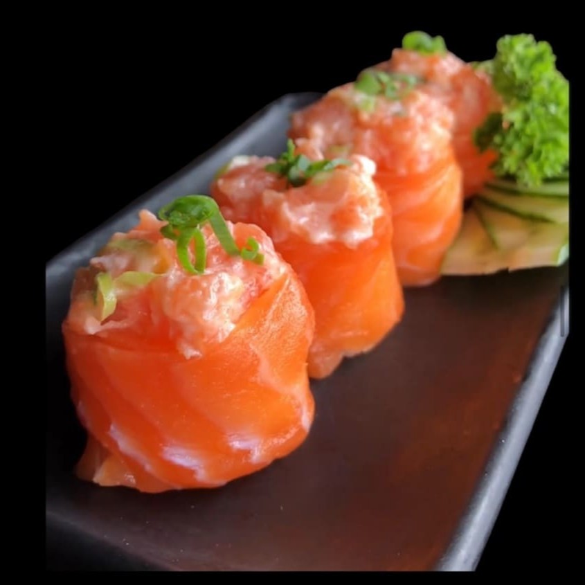 1 temaki - salmão e cebolinha sem arroz. 3 sashimis salmão. 3 sashimis Maçaricado com geleia de pimenta. 3 Joe de salmão sem arroz 3 Joes salmão com couve crisp. 3 sakezushi flambado finalizado com gergelim e raspa de limão.