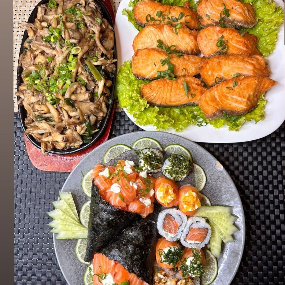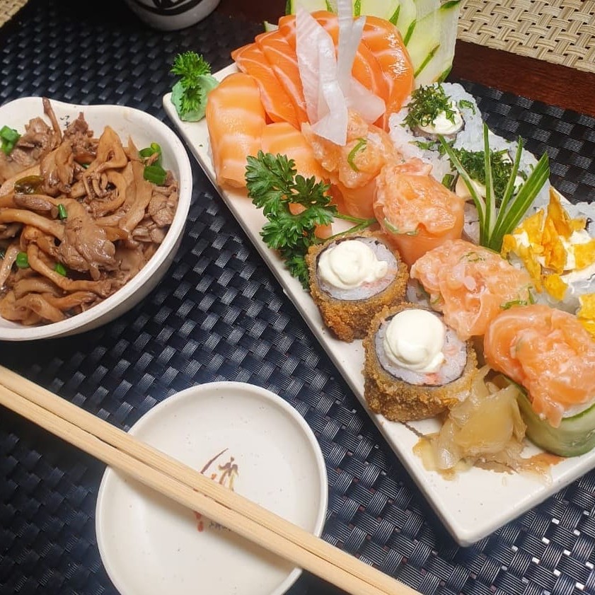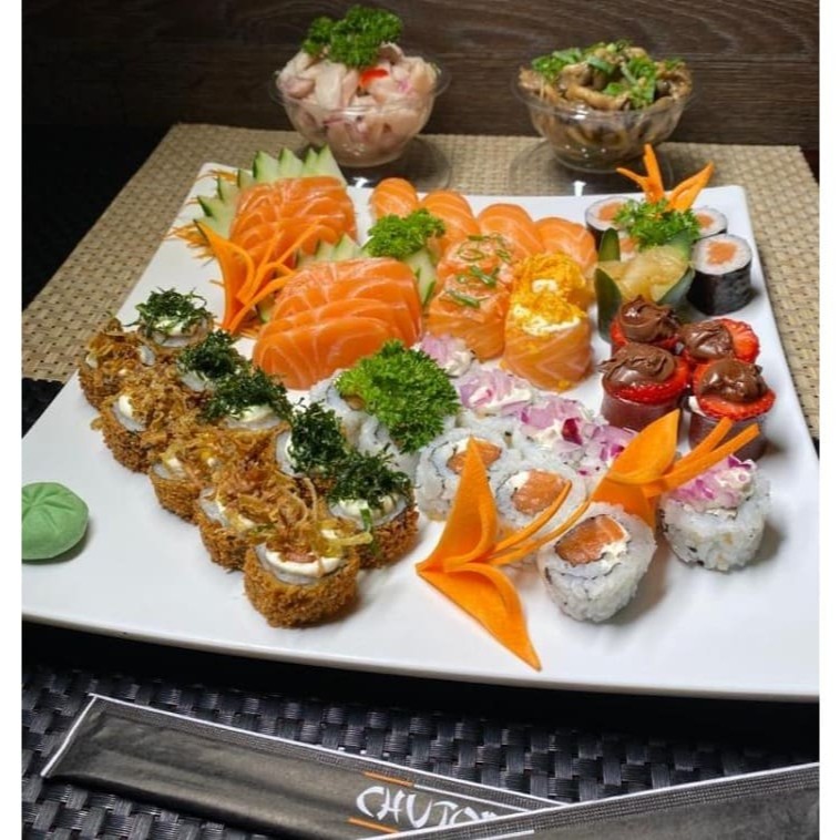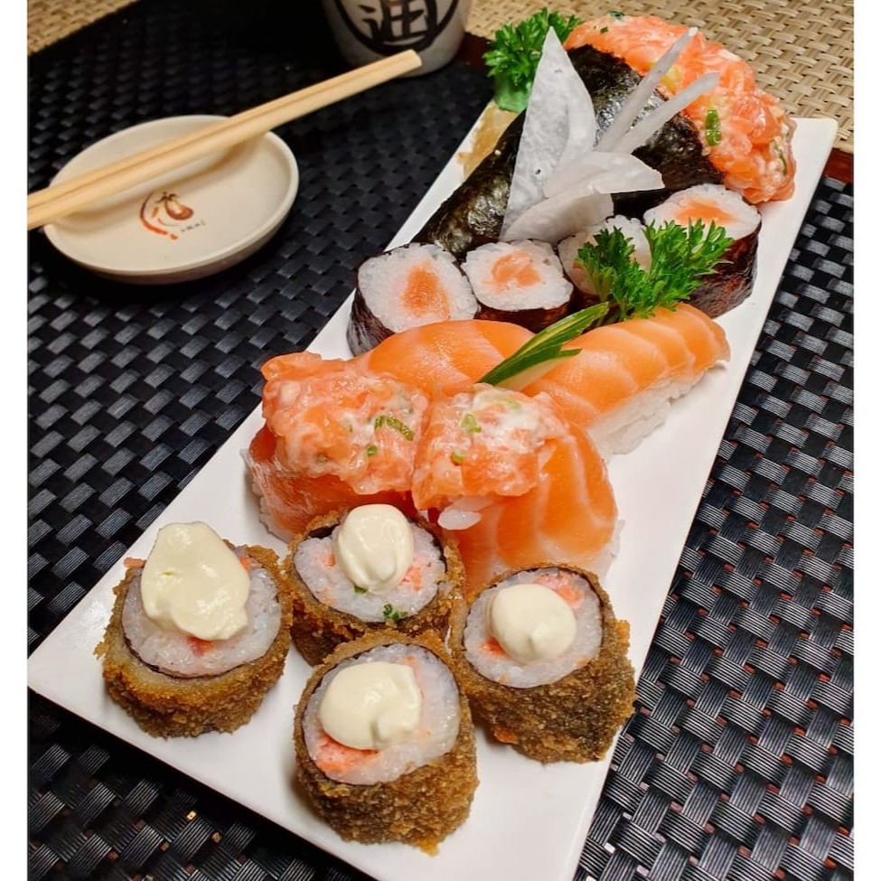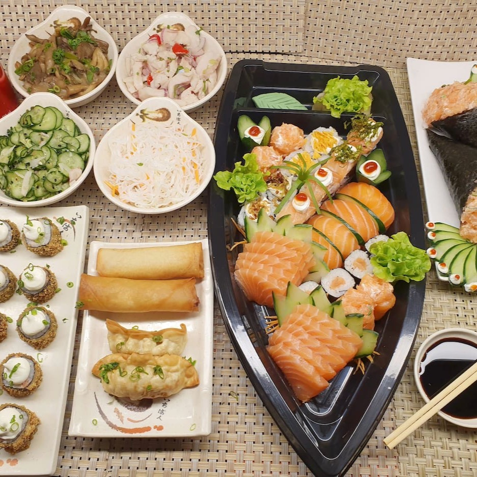 16 Sushis Variados, 1 Ceviche,1 Shimeji,2 Rolinhos Primavera, 3 Salmão Grelhado