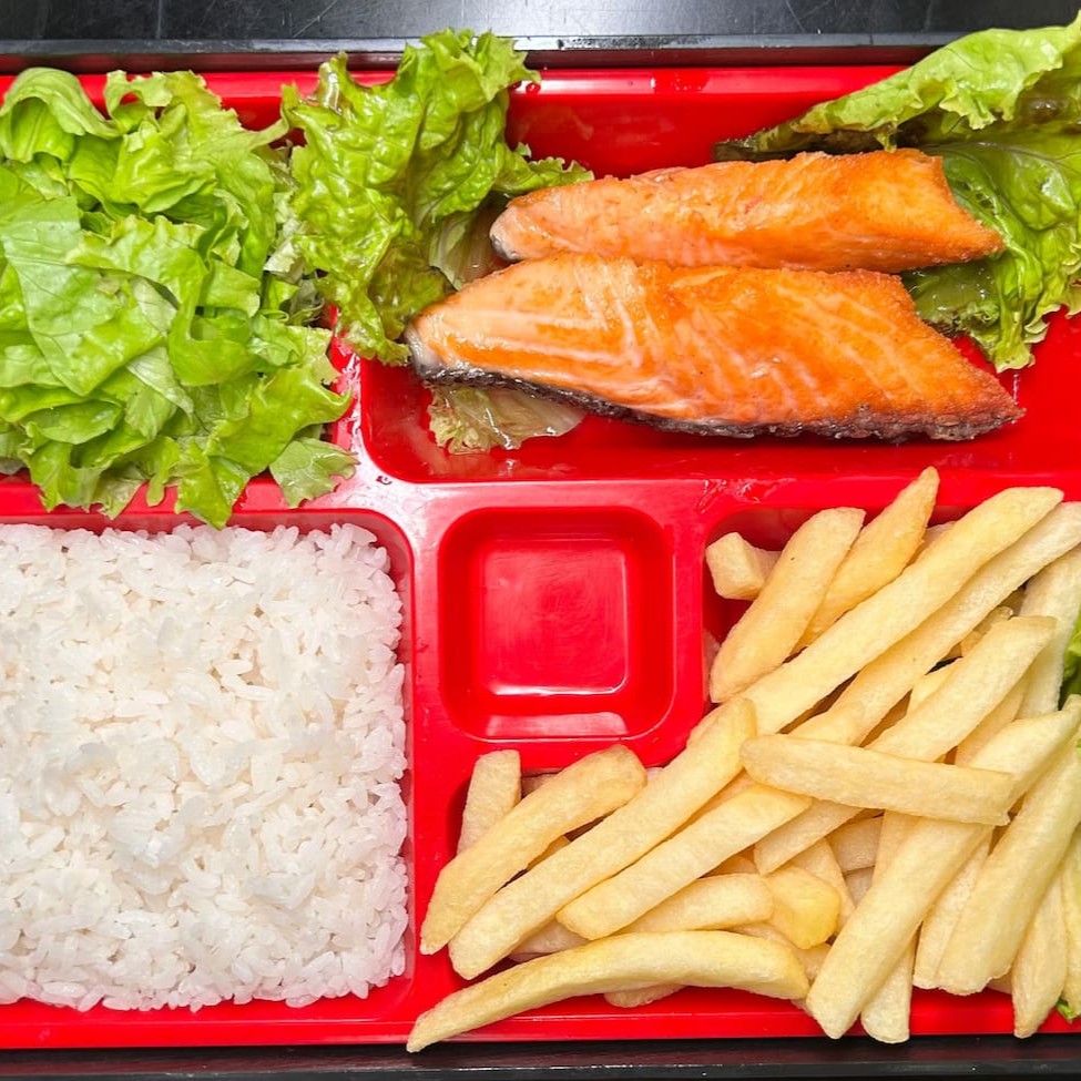 Frango ou peixe grelhado, batata frita, arroz e salada de folhas