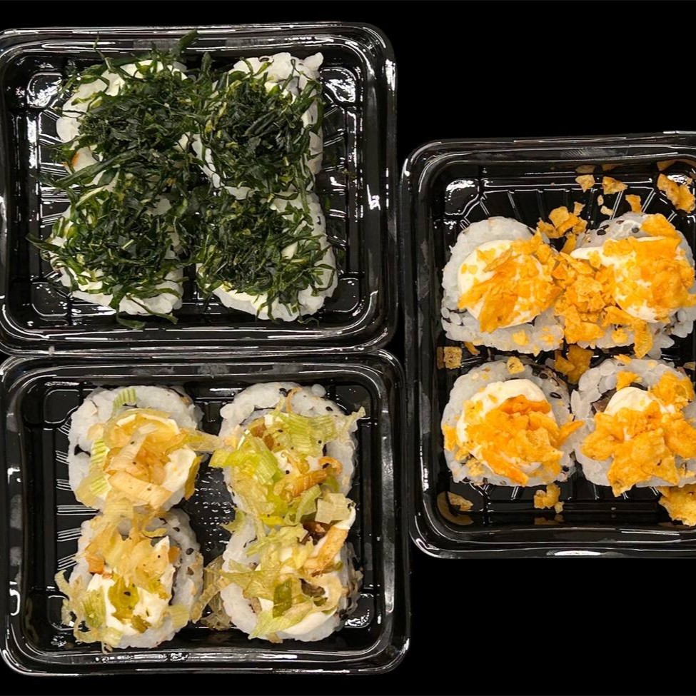 4 uramaki com couve, 4 uramaki com Doritos, 4 uramakis com alho poró