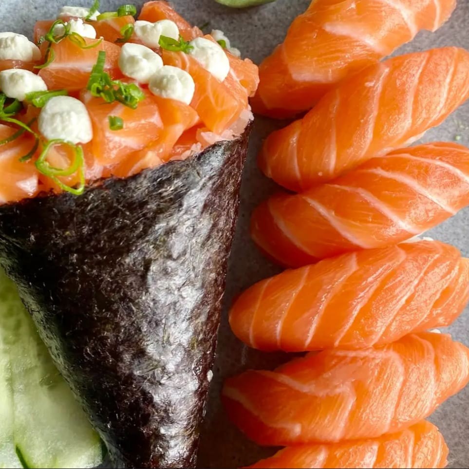 1 Temaki de salmão com cream cheese e cebolinha e cinco sashimis de salmão