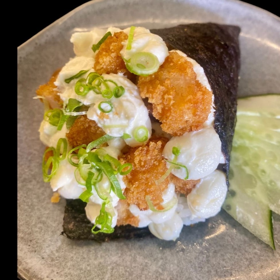 Camarão enrolado com salmão, Catupiry, azeite, cebolinha, tarê e tempero do cheff
