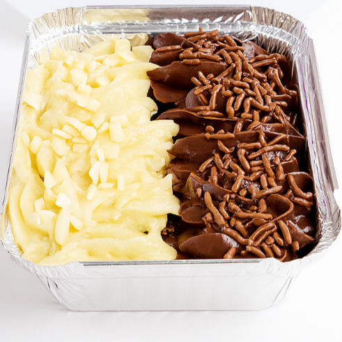 Bolo de chocolate fofinho na marmita, metade coberto com brigadeiro de Ninho cremoso e metade com brigadeiro tradicional. Uma combinação irresistível para quem ama chocolate em dose dupla!