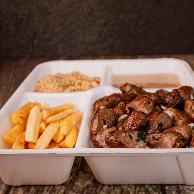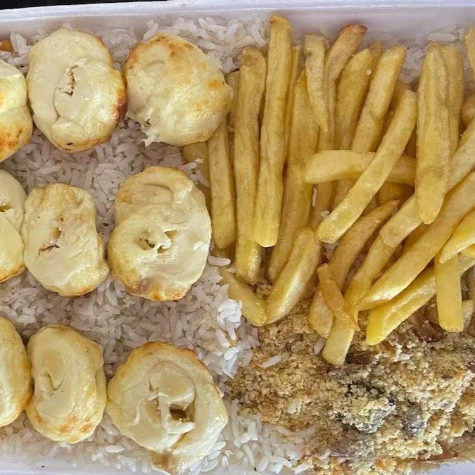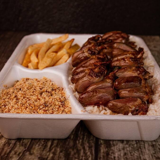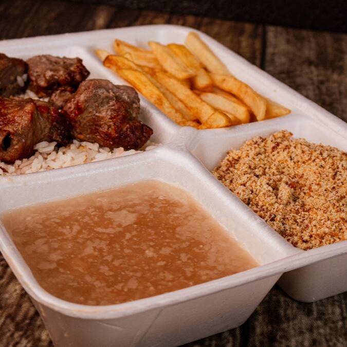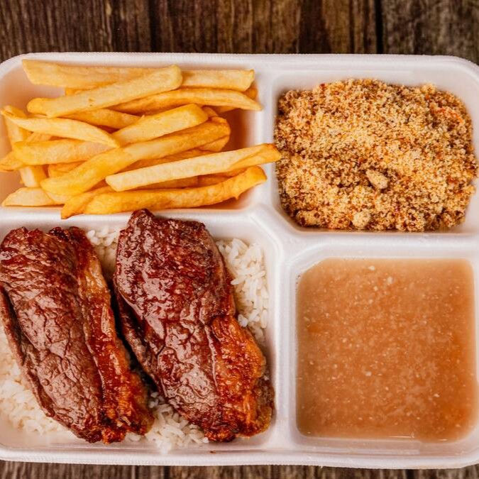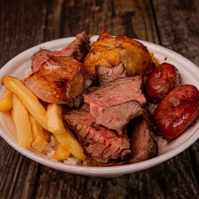 Arroz, Feijão, Farofa, Fritas e Carne Assada Mista