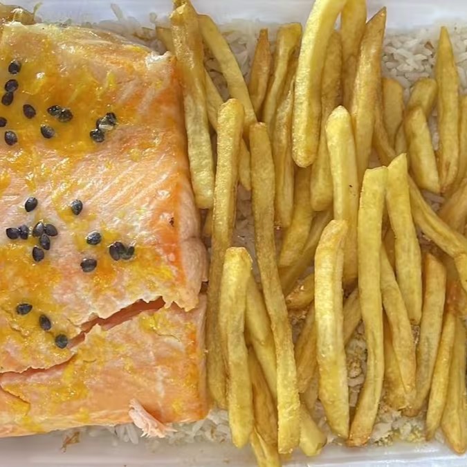Salmão, molho de maracujá, arroz, feijão, fritas