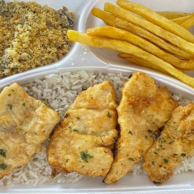 Filé de Merluza , arroz, feijão, batata, farofa