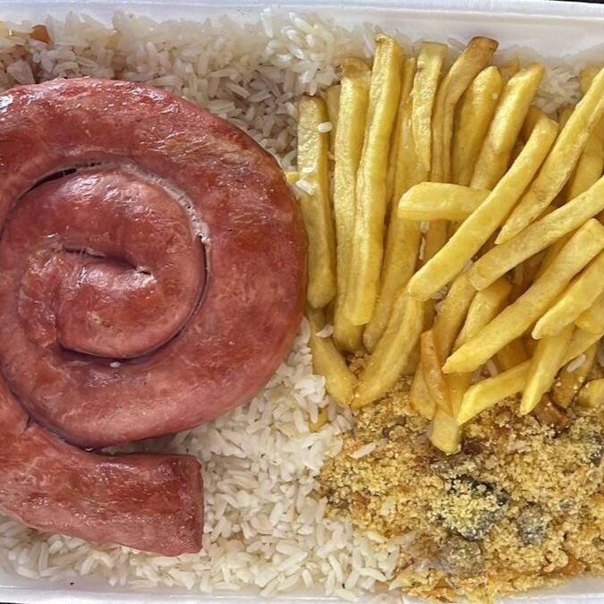 Linguiça apimentada, arroz, feijão, batata, farofa