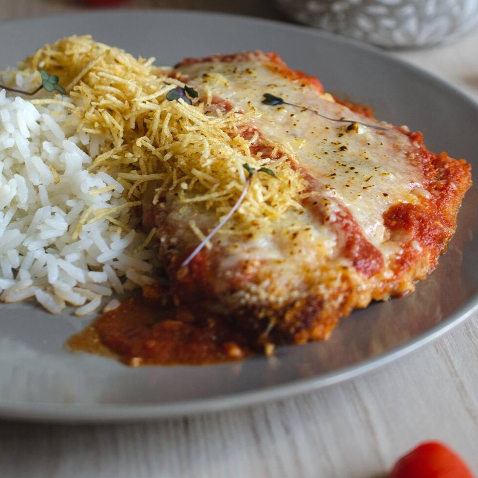 Delicioso filé de frango à parmegiana, perfeitamente empanado e frito, coberto com nosso molho de tomate caseiro e queijo derretido. Acompanha uma porção generosa de arroz branco e batatas palha. Uma combinação irresistível para os amantes da culinária italiana. Experimente já!