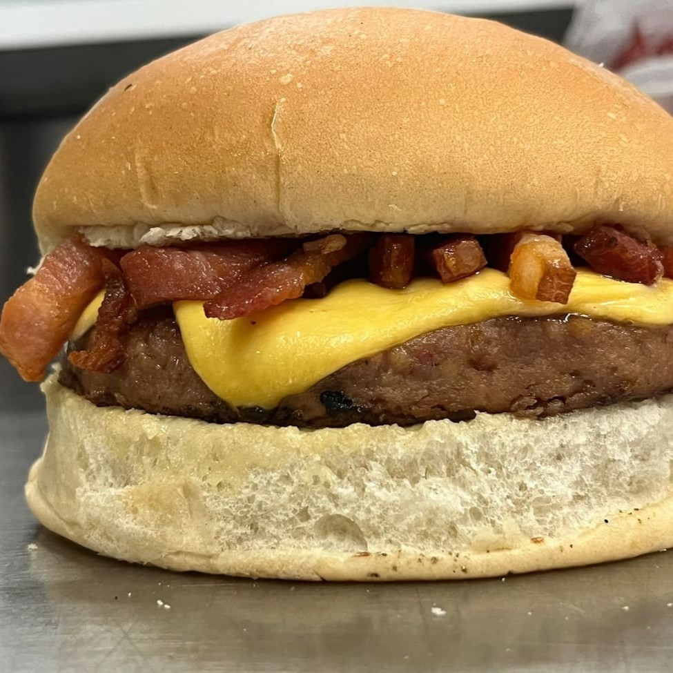 Pão, delicioso hambúrguer 120g, queijo, bacon