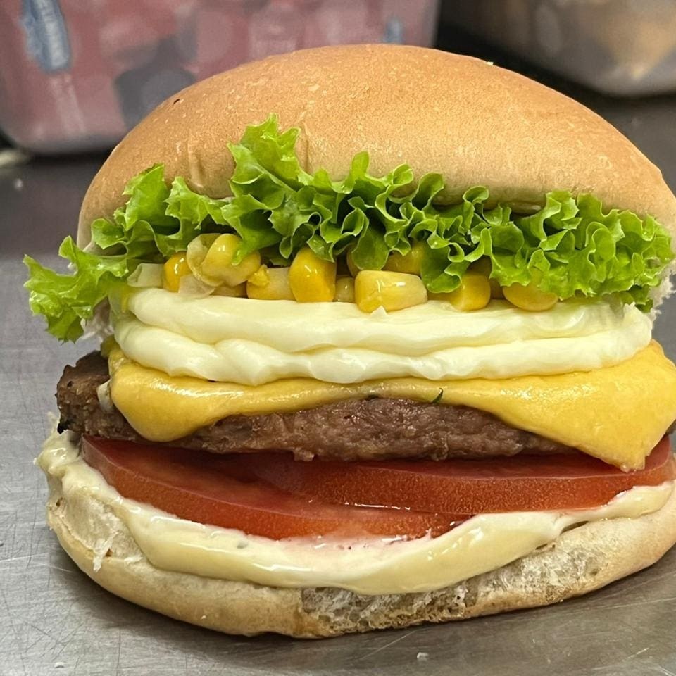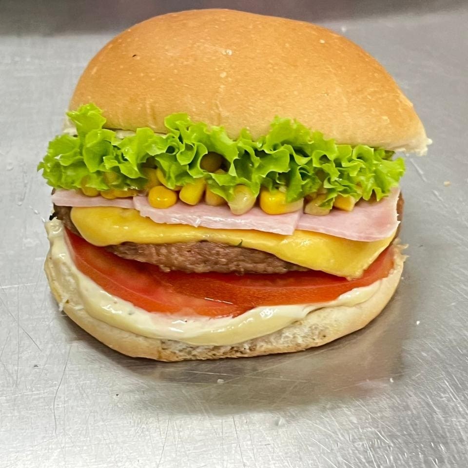 Pão, delicioso hambúrguer 120g, queijo, milho, presunto, alface, tomate, maionese